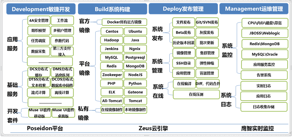 多种服务和工具:从资源监控运维,Docker容器管理到应用开发、发布、部署、运行,都提供了各种PaaS服务、中间件和工具。